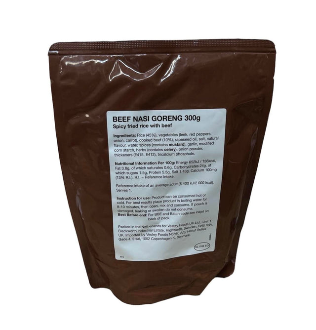 The British Military Ration Main Meal Pouch - Beef Nasi Goreng 300g are great for outdoor use or alternatively stocking up your long term survival supplies! These pouches were originally designed for use within the British military, thus are perfectly nutritionally balanced for survival purposes. You can eat them cold straight from the bag or boil in the bag for a quick and easy meal within minutes!