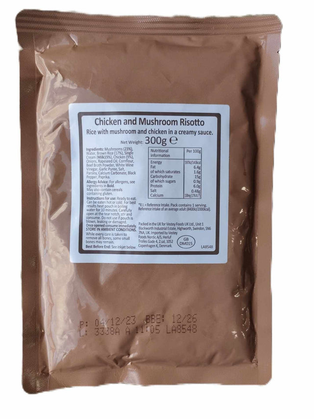 The British Military Ration Main Meal Pouch - Chicken & Mushroom Risotto 300g are great for outdoor use or alternatively stocking up your long term survival supplies! These pouches were originally designed for use within the British military, thus are perfectly nutritionally balanced for survival purposes. You can eat them cold straight from the bag or boil in the bag for a quick and easy meal within minutes!