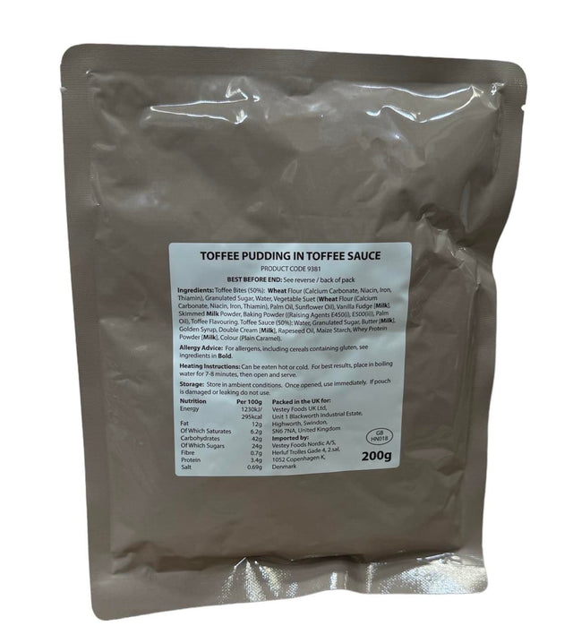 The British Military Ration Main Meal Pouch - Toffee Pudding In Toffee Sauce 200g are great for outdoor use or alternatively stocking up your long term survival supplies! These pouches were originally designed for use within the British military, thus are perfectly nutritionally balanced for survival purposes. You can eat them cold straight from the bag or boil in the bag for a quick and easy meal within minutes!