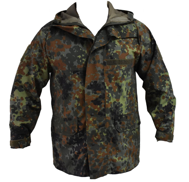 The German Military Goretex Flecktarn Camo Jacket has been designed specifically to be used by the German Military to keep them warm when on outdoor pursuits. For any avid survivalist or outdoor enthusiast this jacket is a must have, as it has been made from high quality goretex for that needed breathability, as well as resistance to any weather. Consisting of two front pockets this jacket can store away and protect your valuables whilst allowing you to have easy access to them when you need them the most. Finishing the jacket is the included hood with drawstring which provides you with that added protection from the wind and rain!