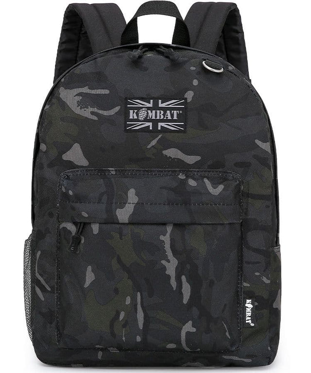 The Kombat UK Street Pack features a main compartment for larger items, a front zippered pocket for quick access, and a side mesh pocket that's ideal for keeping your water bottle handy. Its black multi-terrain pattern adds a rugged and practical touch to the backpack's aesthetic.