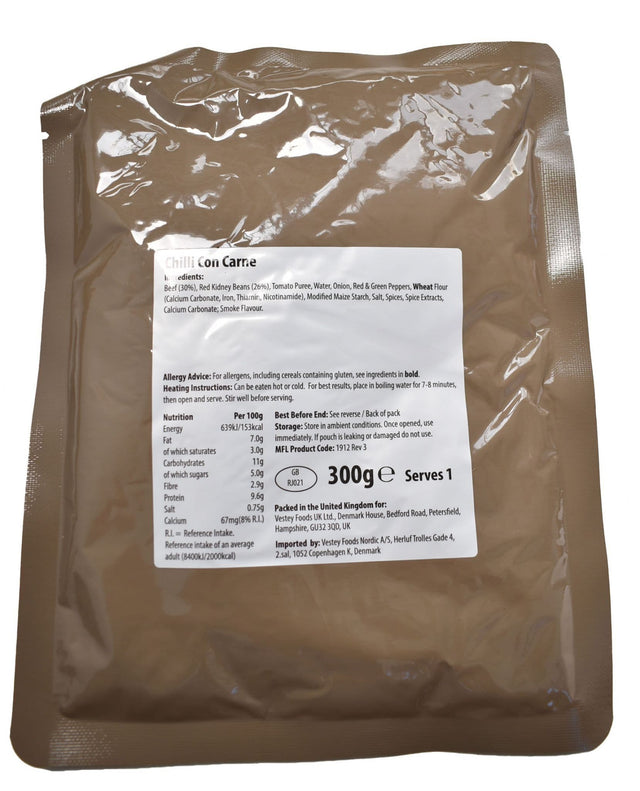 The British Military Ration Main Meal Pouch - Chilli Con Carne 300g are a quick, easy and ready to eat product which is perfect for outdoor use. These pouches were originally designed for the British military, meaning they are perfectly nutritionally balanced for survival purposes. You can eat them cold straight from the bag or alternatively boil in the bag for a quick and easy meal within minutes!