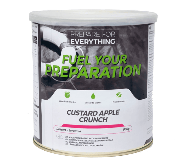The Fuel Your Preparation Freeze Dried Food Ration Meal Tin - Custard Apple Crunch is perfect for when you fancy a sweet treat or a quick and easy energy boost. Freeze dried to lock in all the nutrients, all you have to do is add boiling water and you will have a delicious dessert that the whole family is sure to love. At just 980g per tin, each tin is really easy to store and contains a total of 14 servings! With a shelf life of 25 years, you can't go wrong with adding this meal tin to your long term survival supplies.