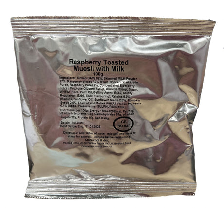- Out of stockBritish Military Ration Meal Breakfast Pouch - Raspberry Toasted Muesli With Milk 100g €3,95Unit price /Unavailable